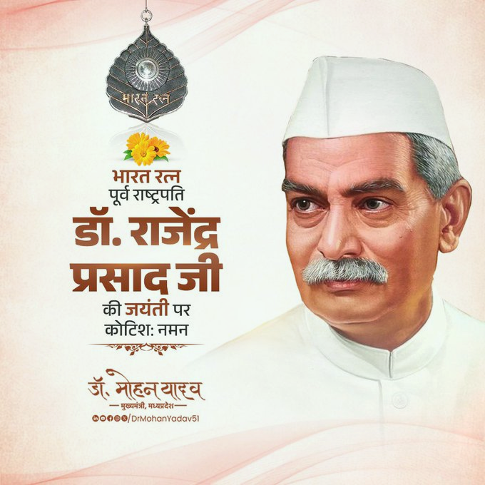 मुख्यमंत्री डाॅ. यादव ने साेशल मीडिया एक्स पर पाेस्ट कर भूतपूर्व राष्ट्रपति डाॅ. राजेन्द्र प्रसाद काे जयंती पर याद करते हुए कहा- भारत रत्न, देश के प्रथम राष्ट्रपति, डॉ. राजेंद्र प्रसाद जी की जयंती पर नमन करता हूं। देश की स्वतंत्रता के आंदोलनों में उनकी अविस्मरणीय भूमिका रही। उन्होंने संविधान सभा के अध्यक्ष के रूप में लोकतंत्र की सशक्त नींव रखने में अमूल्य योगदान दिया। उनका जीवन सदैव प्रेरणादायक रहेगा।