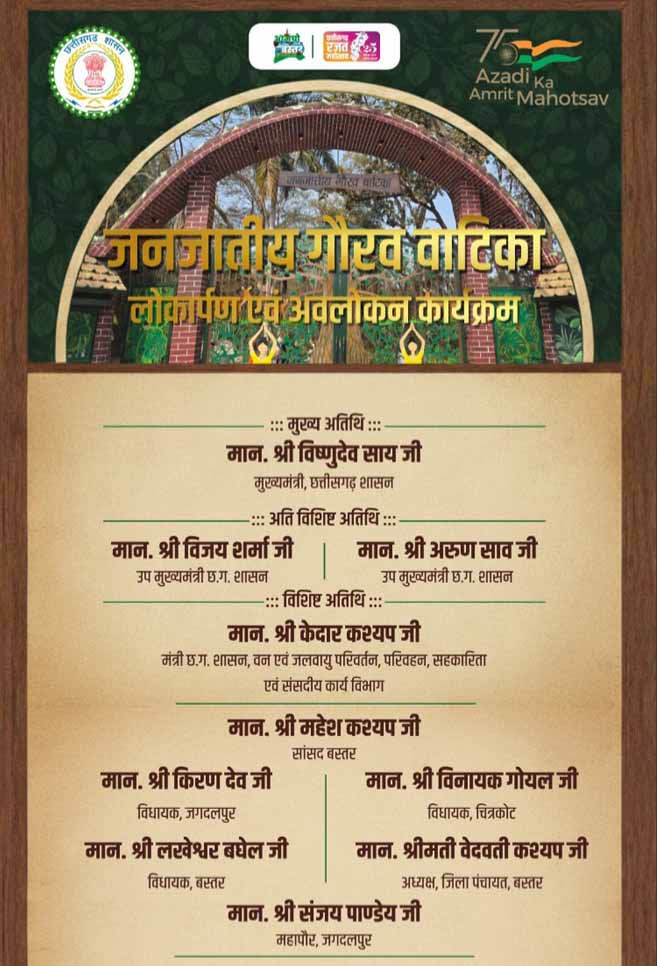कुम्हड़ाकोट स्थित कार्यक्रम स्थल पर होने वाले इस समारोह में बस्तर के सांसद महेश कश्यप, जगदलपुर विधायक किरण देव, चित्रकोट विधायक विनायक गोयल, बस्तर विधायक लखेश्वर बघेल सहित जिला पंचायत अध्यक्ष वेदवती कश्यप और महापौर संजय पांडेय जैसे प्रमुख स्थानीय जनप्रतिनिधि भी अपनी उपस्थिति दर्ज कराएंगे।